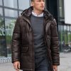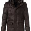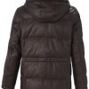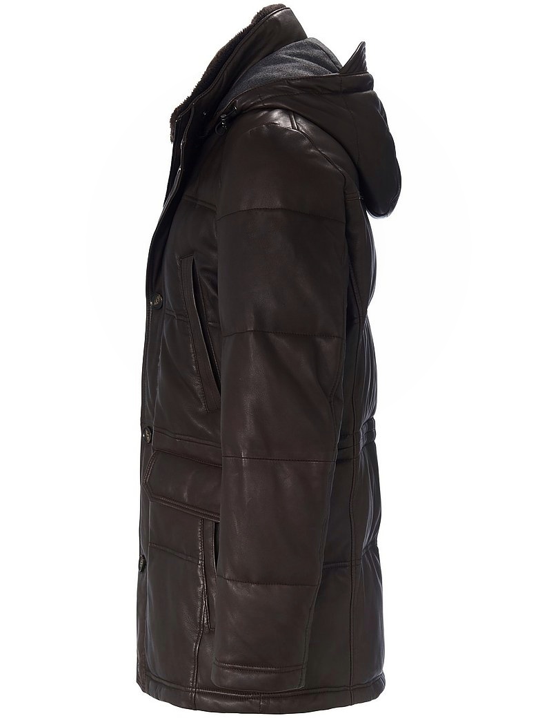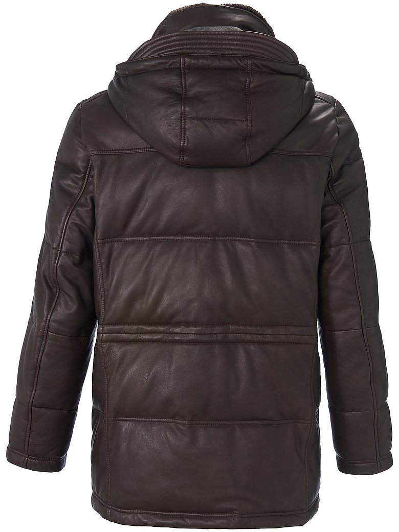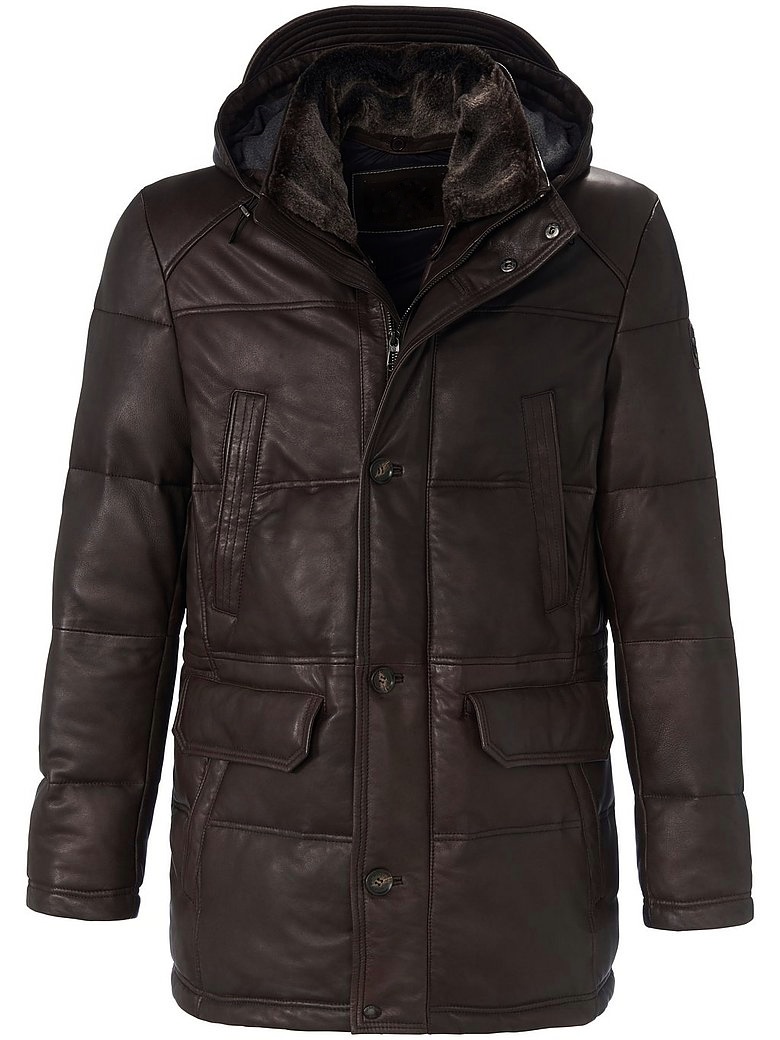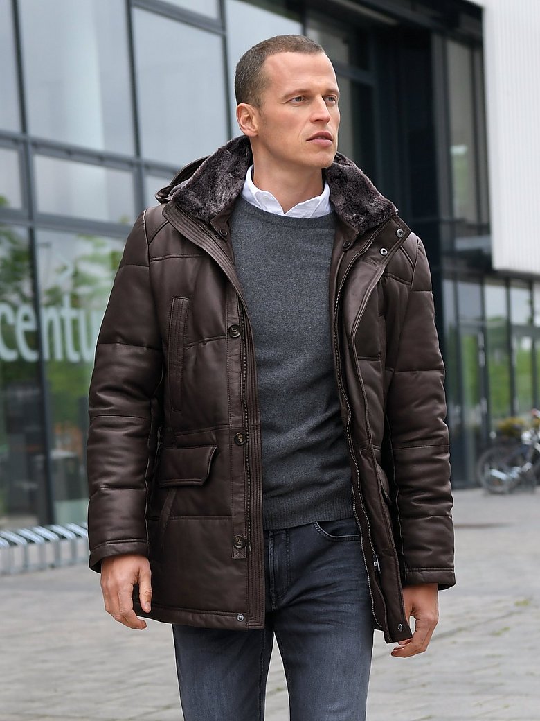 Sporty, wonderfully warm and versatile. Made of high-quality, soft lambskin nappa leather with warm padding and distinctive stitched seams, a high closable collar with warm faux fur on the inside and removable hood. Concealed zip fastener and button placket, 2 breast pockets, 2 large flap pockets with press stud and additional slash pockets. All pockets with press stud fastening.
