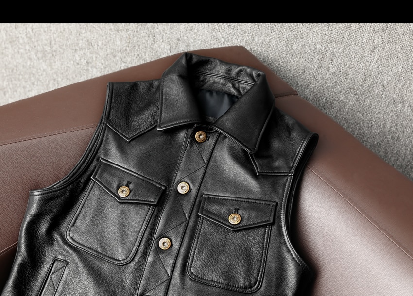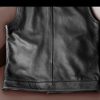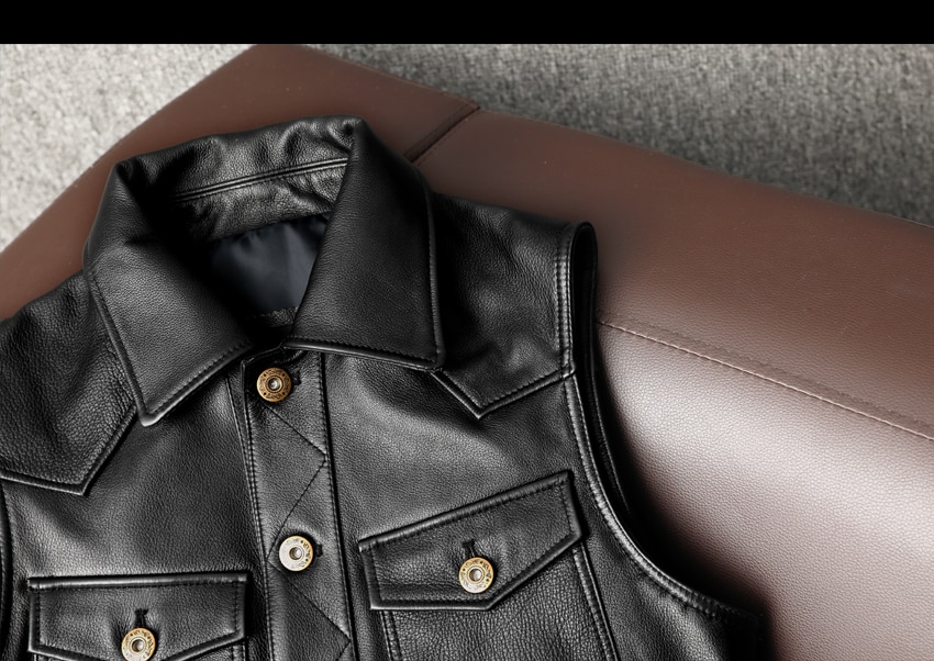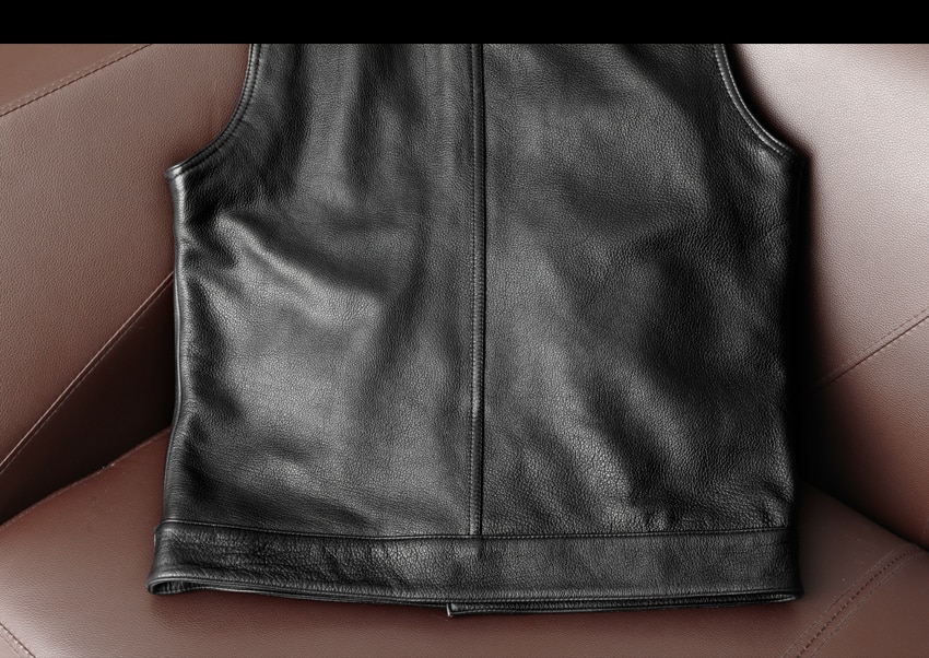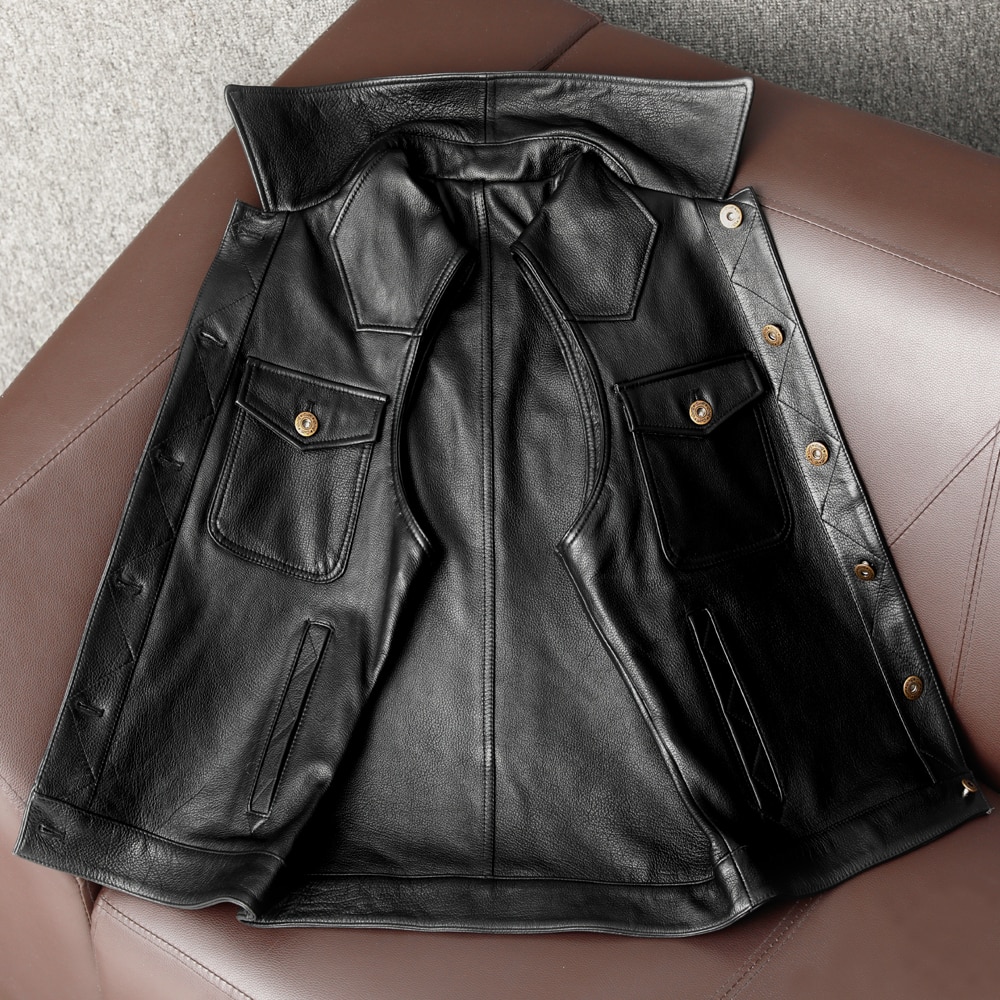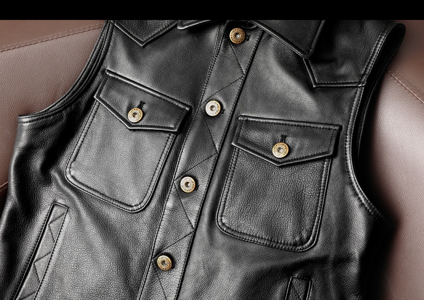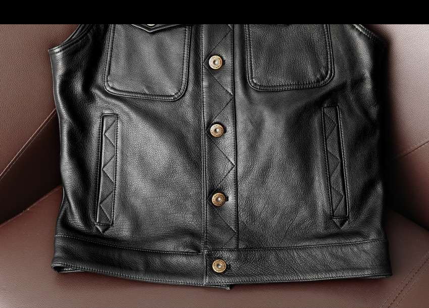 This biker genuine leather waistcoat is closed with gun metal buttons.
